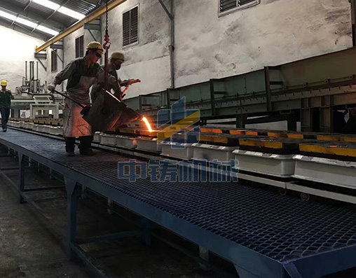 1、全自動造型機(jī)打出來的砂型通過地軌控制系統(tǒng)運(yùn)輸,省掉人工拉砂型;